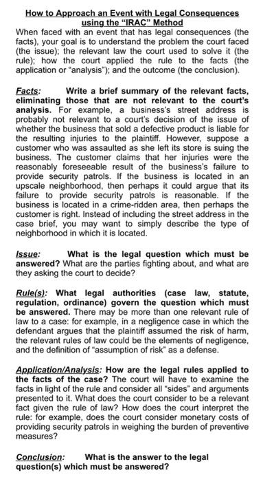 How To Brief A Case Using The Irac Method When Briefing A Case from s2.studylib.net Legal problem solving is an essential skill for the study and practice of law. This becomes an ambiguous detail which comprises of an issue in the law questions. Oh, did you lose track? Talk what the issue was, what rule did you find, if you were able to apply it successfully and what result did you observe. No, the issue does not mean what problem you are facing in your law assignment writing. Who is the author of the irac method? Suppose that there is some lawsuit that has to file within one week of the issuance of the legal notice, okay?the legal notice was issued on a monday. Issue, rule, application, and conclusion.